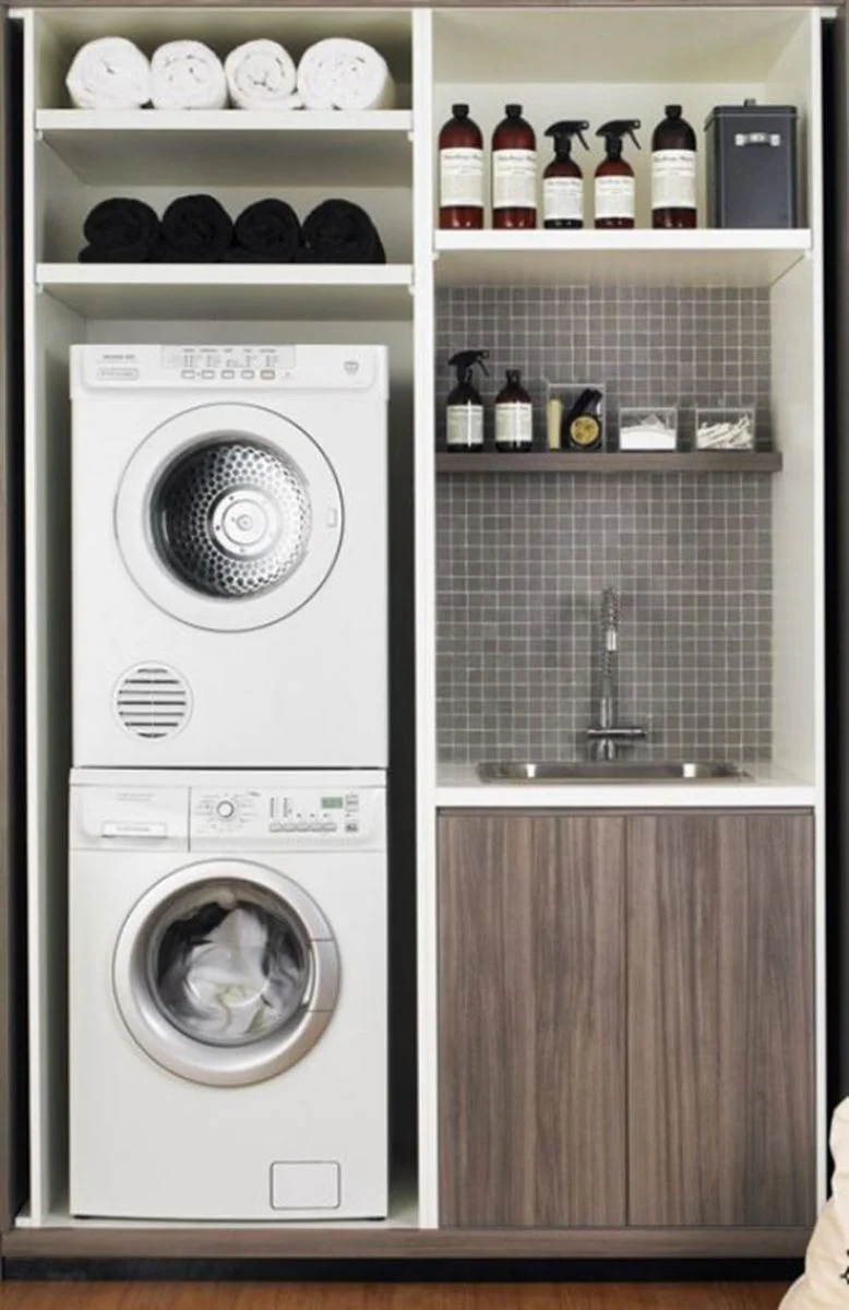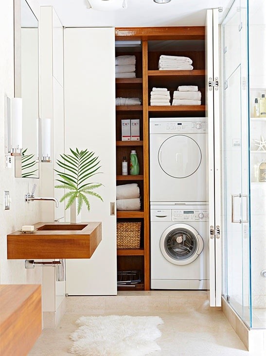When Ms. Avery Etta was in my belly, I was already more overwhelmed by the thought of laundry and dishes piling up in the a.p.t. than by birthing and taking care of an infant. Upon seeing that pink plus sign, we immediately had a contractor and plumber come over to take a look at laundry options.