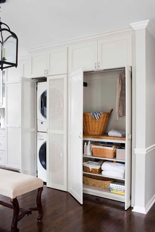 After the initial spot we thought we could add a stacked washer/dryer was deemed a no-go (the hollow wall in my closet apparently houses lots and lots of electrical components), we explored the idea of expanding the custom cabinetry in our kitchen to house a mini-laundry closet.