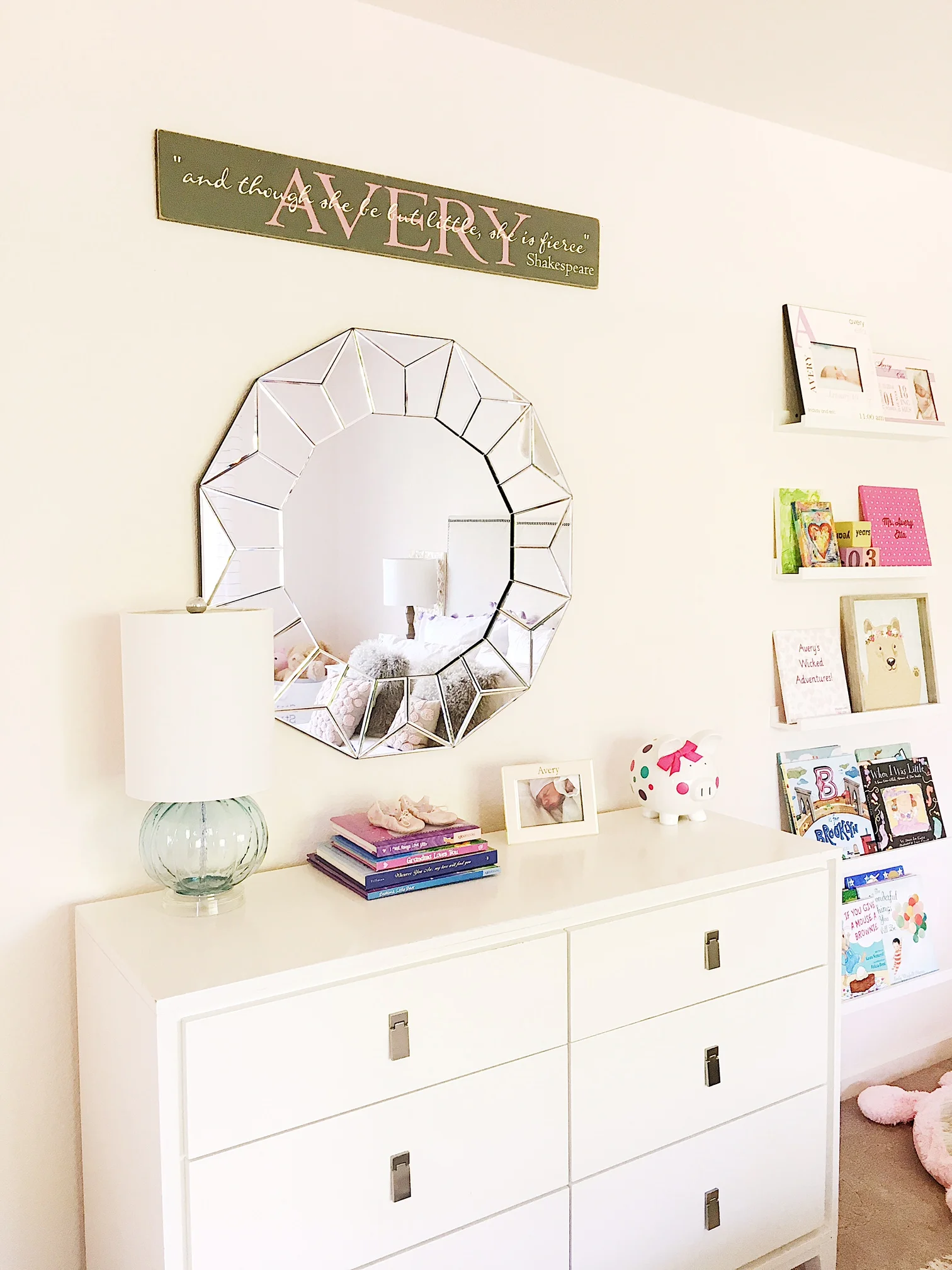 And, Homegoods for the win again with this pair of whimsical prints and little blue glass lamp! (I'll admit it, I have a problem. But listen - if coffee and Homegoods are the worst addictions I have, then I'm not sorry.) The dresser used to be a changing table back in the day, it's grown with us well! It's from West Elm, as well as this beautiful basket that I don't think I will ever tire of. Mirror is an oldie but goodie from Wayfair, and the Avery sign was a gift.
