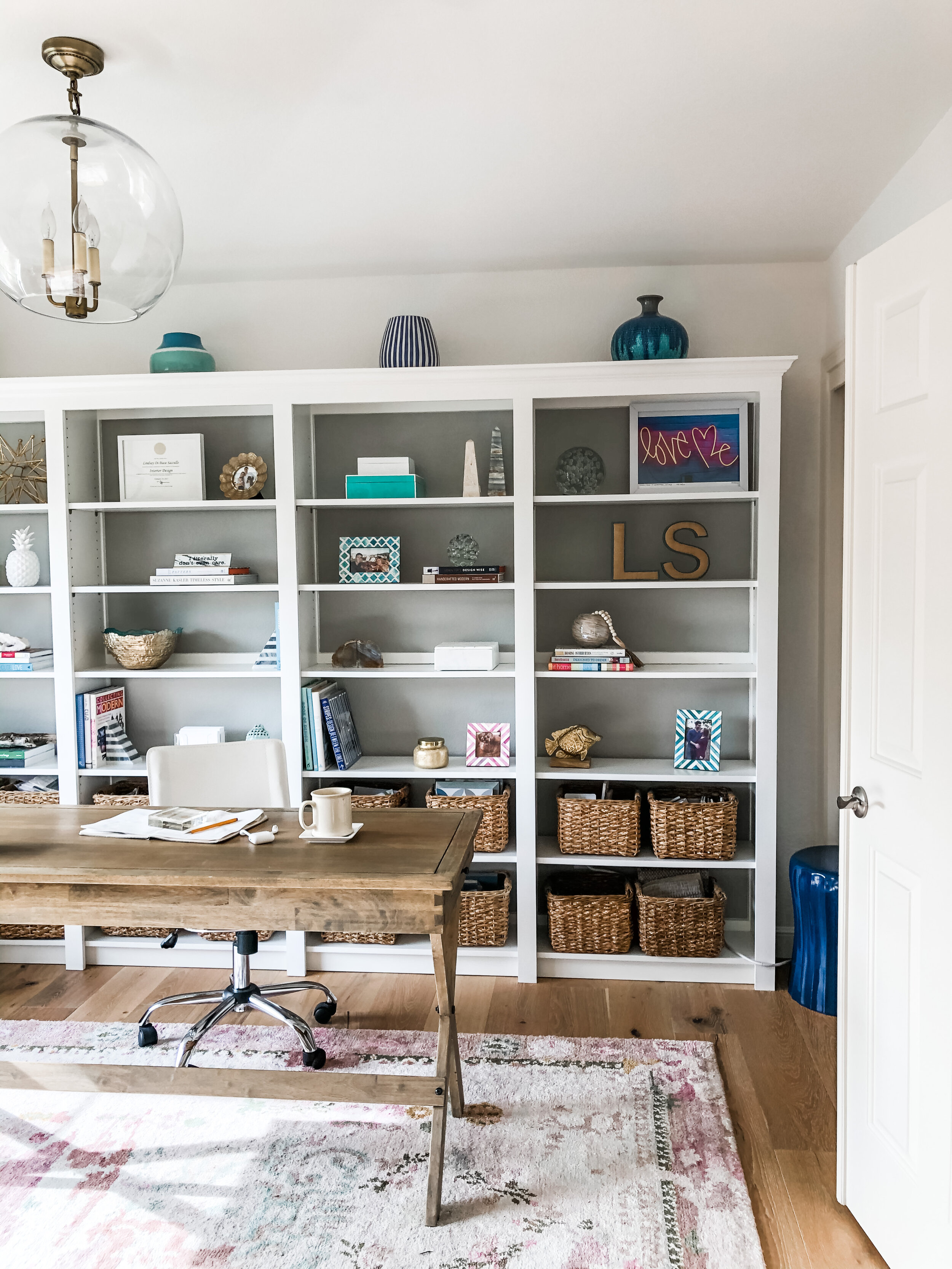 For me, that means trying to keep my desk clear, and my samples corralled in a somewhat orderly fashion. I am definitely not a professional organizer, but often during client projects the lines can be blurred, and I find myself helping with it regardless, at least in a visual manner. I can’t guarantee the contents of these baskets are filed away in an organized manner (although if quarantine continues through the summer, maybe I’ll get to it…). But because the baskets all match in size and color, and they neatly line the bottom two shelves, they appear to be organized. And that, my friends, is enough for me to feel at peace in my space.
